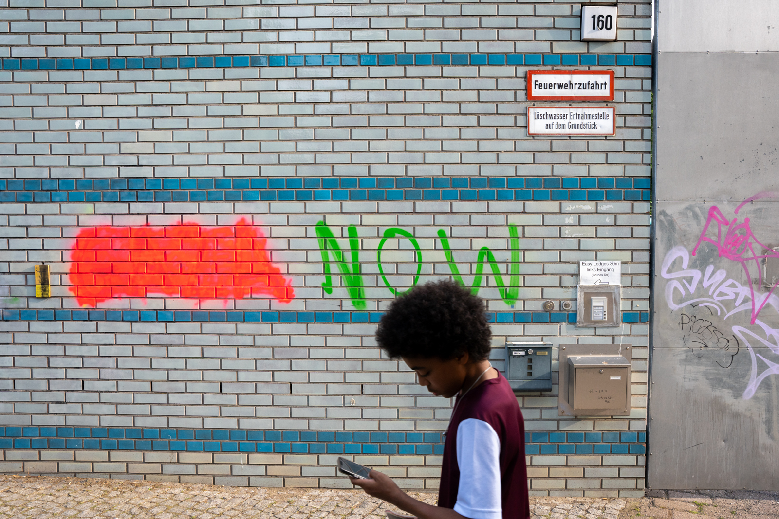 Today, it is difficult to imagine the recapitulation of this archetypical dream in our own neighborhoods. The news, increasingly unbound from physical objects with regularly scheduled hours of distribution, is no longer a force of communal attraction. There is little certainty that any two people, even if they live next to each other, are engaging with overlapping sources. Distant images are disseminated to oversaturated eyes in solitude. Amid this transformation, the walls of Berlin, a city often compared to Babylon, go on talking like the work of so many disembodied hands, delivering messages whose ultimate import we cannot fully comprehend, even as political authorities would prefer us not to see them.