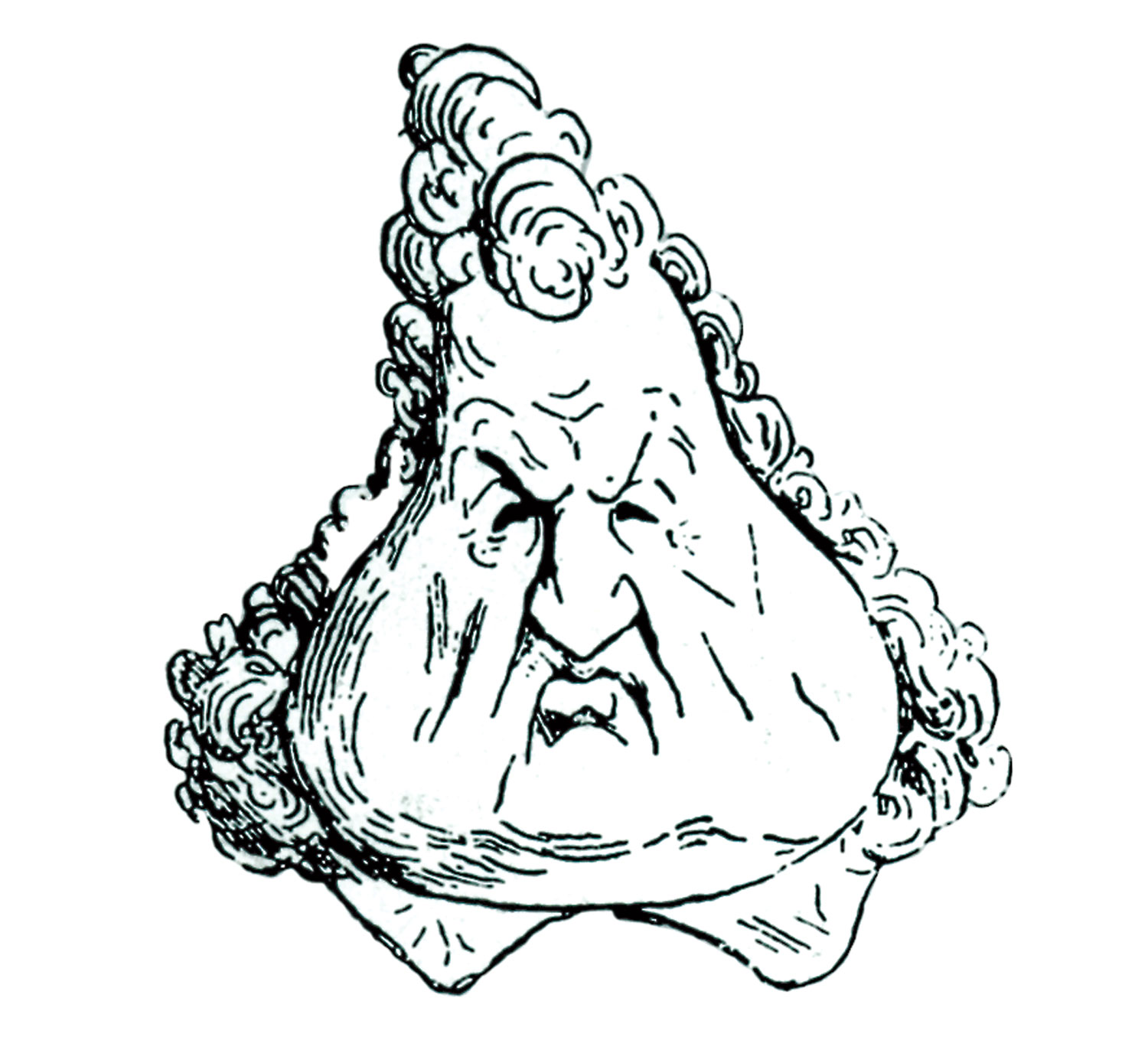 The most caustic weapon in La Caricature’s imagistic arsenal was a figure suggesting the ostensible resemblance of King Louis-Philippe’s face to a pear. Prosecuted in May 1831 for publishing two drawings in La Caricature that depicted men who looked like the King, Philipon’s defense ran that if all drawings resembling the King were to be censored, artists would have little left to draw. The government certainly couldn’t censor everything wide at the bottom and narrow at the top, Philipon continued, and to prove his point, he quickly sketched the king’s transformation into a plump pear. Immediately following his widely publicized acquittal, the pear drawings appeared in La Caricature. The likeness resonated with the people of France, and the symbol took off. Pears decorated the walls and buildings of Paris; caricaturists churned out drawings of pears in compromising positions; and common parlance began to denote La Caricature as The Pear. Stendhal’s Lucien Leuwen, Hugo’s Les Miserables, and the memoirs of Thackeray, Heinrich Heine, and Baudelaire all refer to the fruity representations ubiquitous in Paris between 1830 and 1835; an entire book of puns on the theme, Physiology of the Pear, was published in 1832. La Caricature followed the first drawings with several more: The allegorical Liberty constrained by a pear-shaped ball and chain; the king stooping to help a child draw a pear on a city wall; pear trees watered with blood; and pear-shaped arrangements of type. In 1833, Philipon published a particularly incendiary drawing depicting a monument in the shape of a pear placed on the site of Louis XVI’s guillotine death. In the ensuing court trial, the prosecution argued that the drawing constituted “a provocation to murder.” To this Philipon replied, “It would be at most a provocation to make marmalade.”