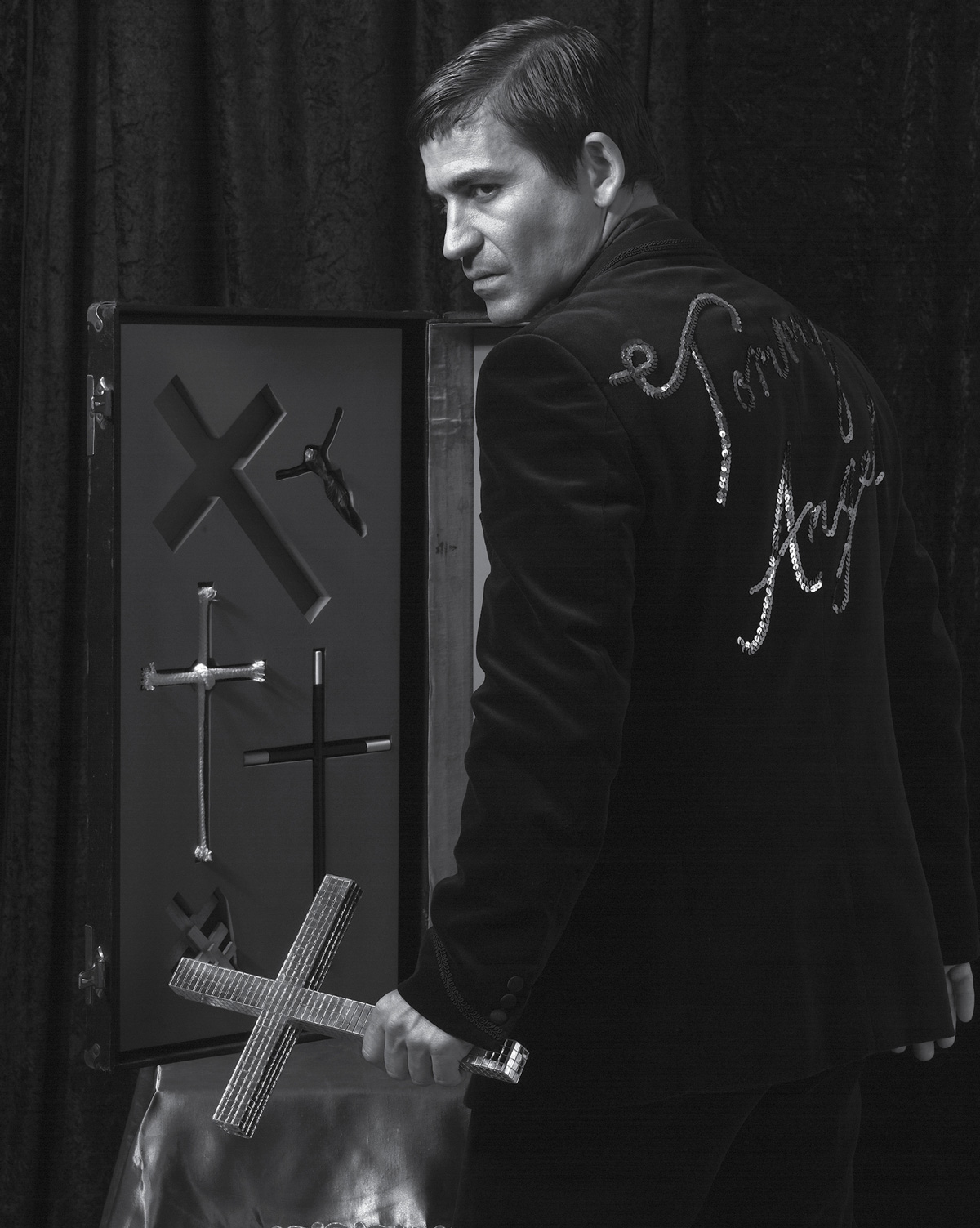The preacher, the magician, and the politician are kindred spirits. Performers all—replete with the exotic trappings of their trade, bearers of secret language and gesture, theatricalized instantiations of transcendental powers—they enact their minor miracles before audiences only too eager to believe. Tommy Angel, the revivalist magician alter ego of British artist Jonathan Allen seen in the two photographic works below, unites the range of these iconic beguilers in one unnervingly slick pulpiteer. At once drawing on and destabilizing the rituals of stage conjuring, the symbolic landscape of proselytizing evangelicalism, and the political instrumentalization of fundamentalist conviction, Angel and his strategic snake-oil gospel pull back the curtain on the sleight-of-hand that inevitably operates behind the scenes of any organized system of belief. “Faith,” says the Bible, “is the substance of things hoped for, the evidence of things not seen.” For Tommy Angel, the nature of faith—magical, religious, or political, not to mention artistic—is just as much about style as substance, and even the most “reliable” evidence is made to seem as uncertain as the location of the pea in a street corner shell game.