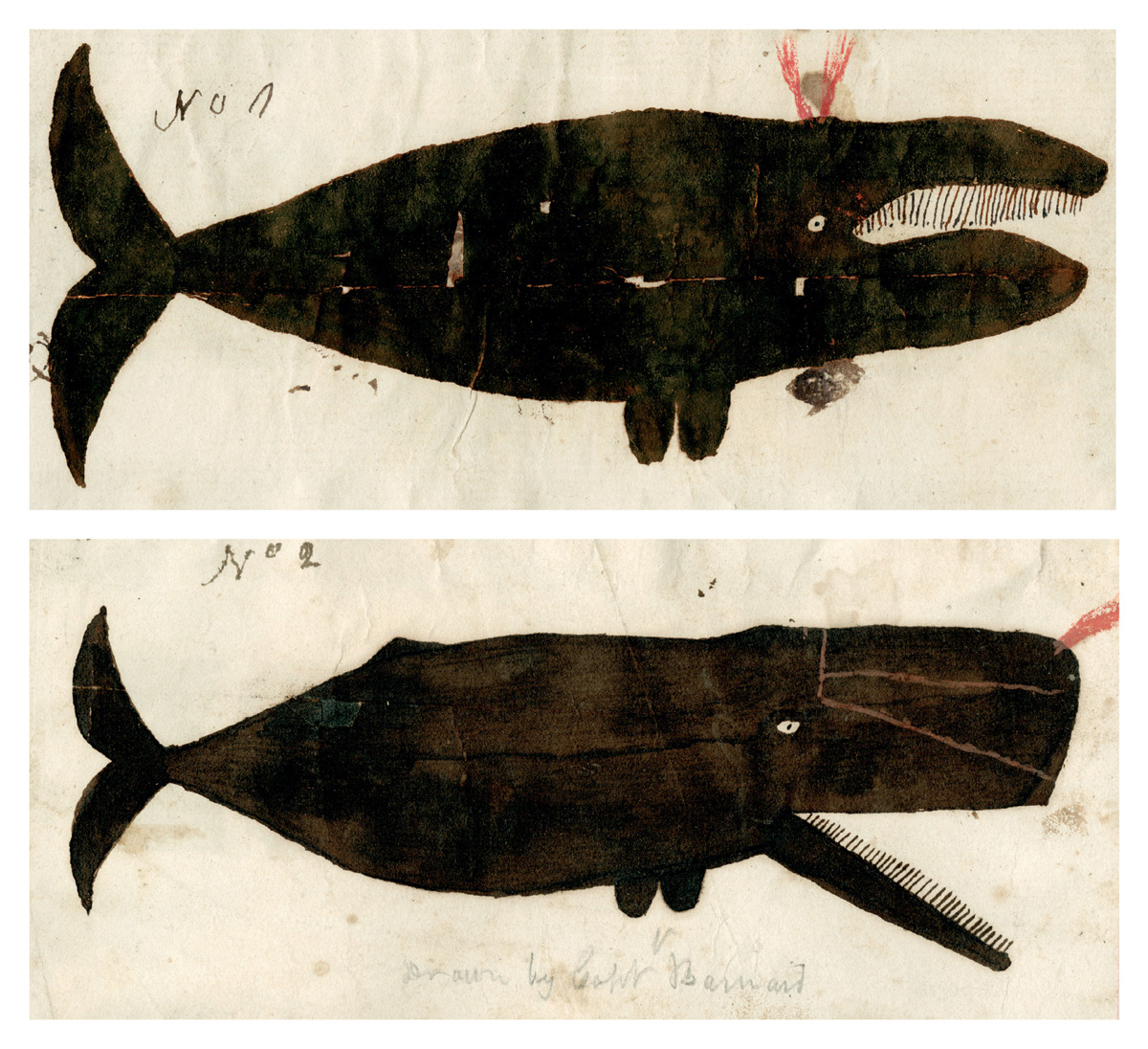 Two whalemen are called in to give testimony. Disconcertingly, they disagree with passion. One says that whales are obviously not fish (he is a captain, and very proud to be a reader of the encyclopedia), and the other says, “As far as I know, they’re fish and that is always how we talked about them in the industry.” So to get at what whalers knew about these animals, to get at ideas about natural history in this expert community, I spent a lot of time in whaling archives in New England, reading logbooks. They’re curious texts. Some of them are pretty skeletal, just laying down wind direction, water currents, ship’s position and bearing—and, of course, whales seen and whales taken. But others are expanded into something like commonplace books or even diaries. Reading between the lines and doing a little hermeneutic voodoo, it’s possible to wrest from those texts some interesting insights into how whalers thought about their prey. Among other things, I show that whalemen had not only an idiosyncratic account of cetacean systematics—a taxonomy for these animals, and a sense of where they fit in the order of things—but also an anatomy and a physiology of some sophistication (though it bore little relation to book-learning on these topics). Sailors’ tactics for dismantling these huge creatures at sea amounted to a kind of elaborate dissection, and you can see traces of that on the cutlines they drew on their pictures of whales: if you look closely at the whales drawn by Captain Barnard, you will see these incisions traced in red ink. In general, the whalemen’s nomenclature for the features of the bodies was remarkably detailed, but in almost precise antithesis to the concerns of formal comparative anatomy, since whalers were preoccupied by just the external eight inches of “blanket layer” (the blubber) on the animals. This was “superficial” anatomy in a deep sense!
