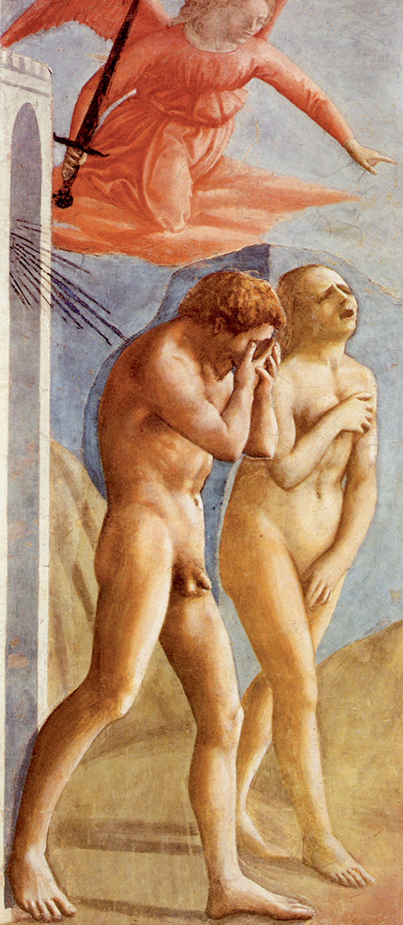 So shame, which rightly belongs to the rebellious human will, gets deflected to the genitals, and every fig leaf so strategically placed reinforces the deflection. Our sexual organs become pudenda, literally “the shameful parts.” It’s curious that this term is more often used to describe women’s anatomy. Consider, for instance, Masaccio’s great Expulsion from the Garden of Eden: Adam bends forward in grief, his hands covering his eyes—but the eyes of the two, once opened, can’t truly be closed—and his penis clearly visible. This is intentional: we see him from the right, with his left foot forward. Had Masaccio placed the right foot forward, our view would have been blocked. But we see Eve’s wailing face clearly, because her right hand covers her breasts, her left her vulva, which is partly obscured anyway by her right leg. She and Adam are out of step. Adam’s posture suggests that he does not want to see, Eve’s that she does not want to be seen, though no one could be looking, as the angel with the flaming sword hovers behind them. Everything in their portrayal suggests that they feel two different shames. Adam’s is closer to the Biblical account, Eve’s to the Augustinian shifting of responsibility to the genitals, the pudenda. If Adam’s shame comports with the Genesis narrative, Masaccio’s overall depiction seems not to, since we are told that God clothed them in “skin coats” before he dismissed them from their Garden. But Masaccio restores them to the moment they discovered their nakedness, thus telescoping the story, emphasizing the connection between exposure and expulsion.