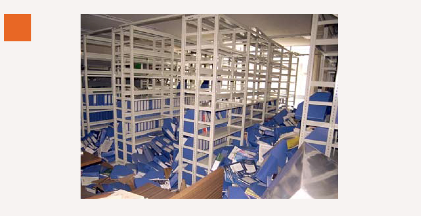 Our project “Fallen Books” is a collection of images of toppled books from libraries located in seismically active areas. The photographs are often taken by librarians and depict the aftermath of earthquakes. The images presented here, part of a larger book project, are identified by the library, the name of the given earthquake, the country, and the date, and are organized according to the relative intensity as measured by the Modified Mercalli Intensity Scale. A descriptive and graphic alternative to the Richter Scale, the Mercalli system primarily quantifies the observed effects of earthquakes on humans and man-made objects on a scale of I through XII. Topographic maps of earthquake areas use the scale’s color code to indicate how far away from the epicenter the earthquake was felt and at what degree of intensity. Copies of Fallen Books are now in the collections of each of the featured libraries. This project is both an archive and a forecast.