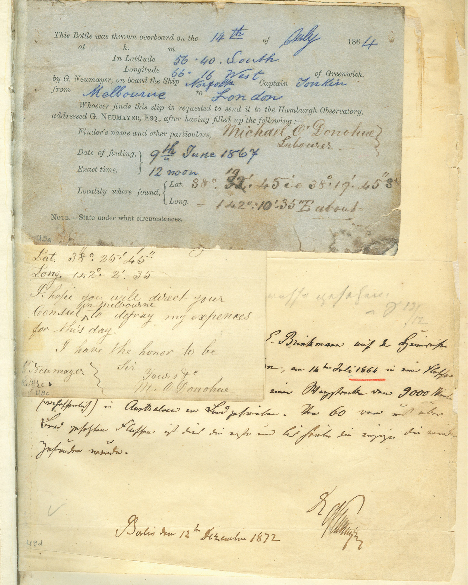 One of the oldest messages in a bottle ever recovered, this document was thrown overboard in a sealed rum bottle from a ship on 14 July 1864 near Cape Horn. It was recovered three years later on 9 June 1867 by one Michael O’Donohue on the Australian coast near Portland. The bottle had travelled 15,800 kilometers. Courtesy Bundesamt für Seeschifffahrt und Hydrographie.