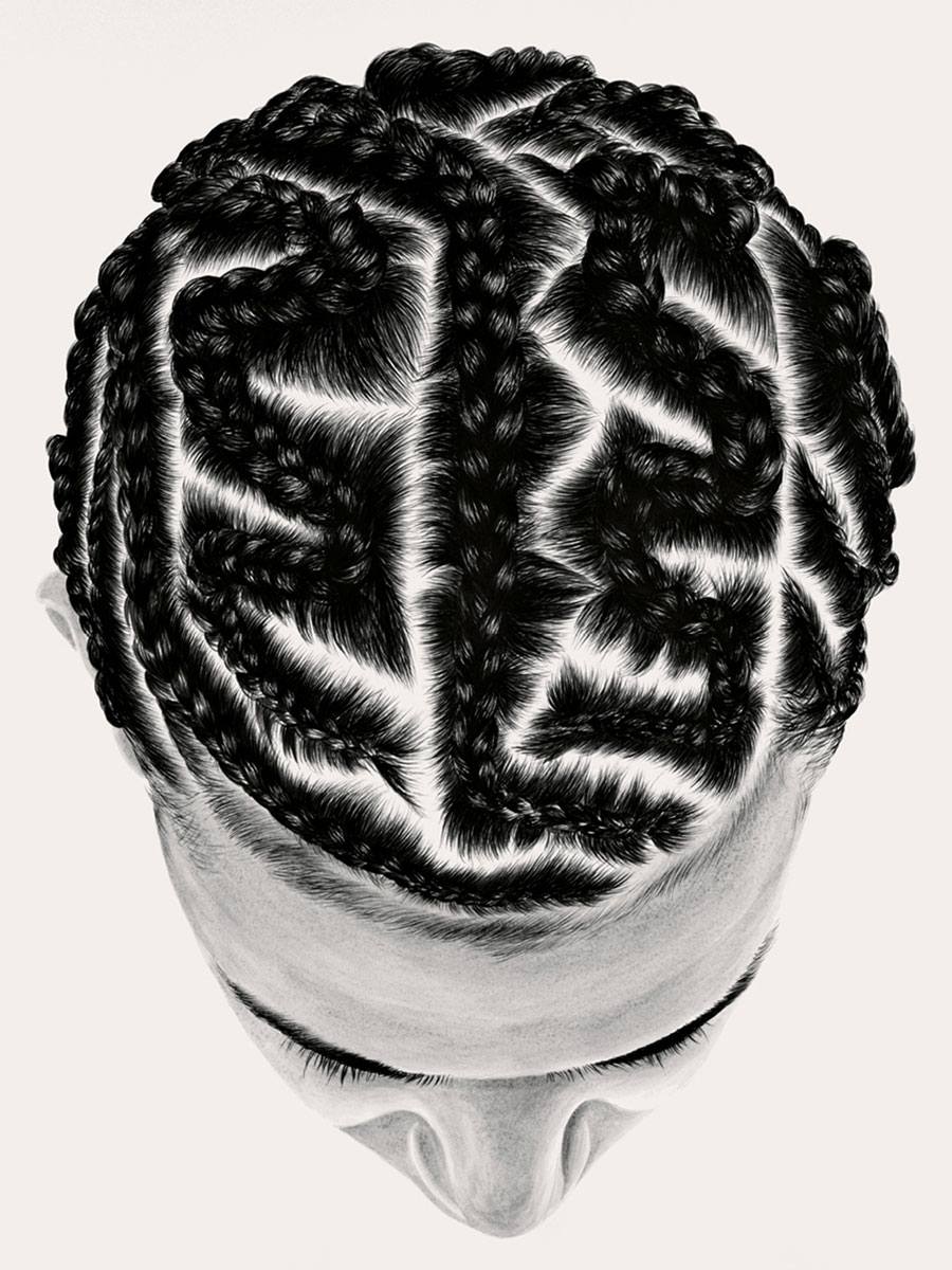 The series of portraits reproduced below were inspired by the artist’s work as a teacher in a New Jersey high school, where she has photographed students for the last eight years. Focusing on the intricate patterns of hair braiding, known as cornrows for their resemblance to agricultural furrows, the works (all acrylic on paper) constitute a typology that evokes both shared ethnic and racial practices and highly individualized expressions of personal identity.