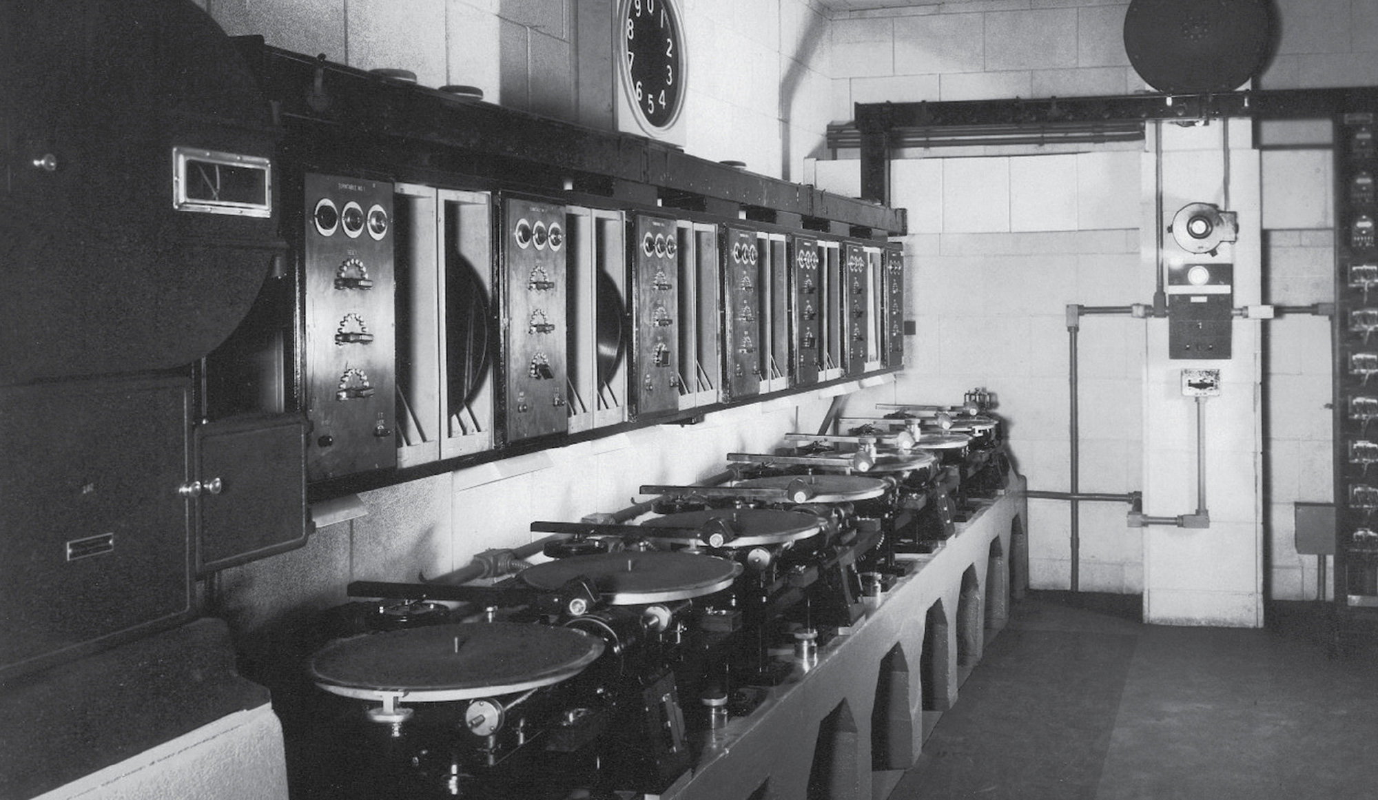 Photo of Vitaphone disk dubbing systems at Warner Brothers’ Brooklyn studios, ca. 1930. The photograph was taken by J. Porter Evans, the chief sound engineer hired to equip the previously silent Vitagraph studios bought by Warners. The complex in Midwood, Brooklyn, is now a school. Courtesy Ron Hutchinson, The Vitaphone Project.