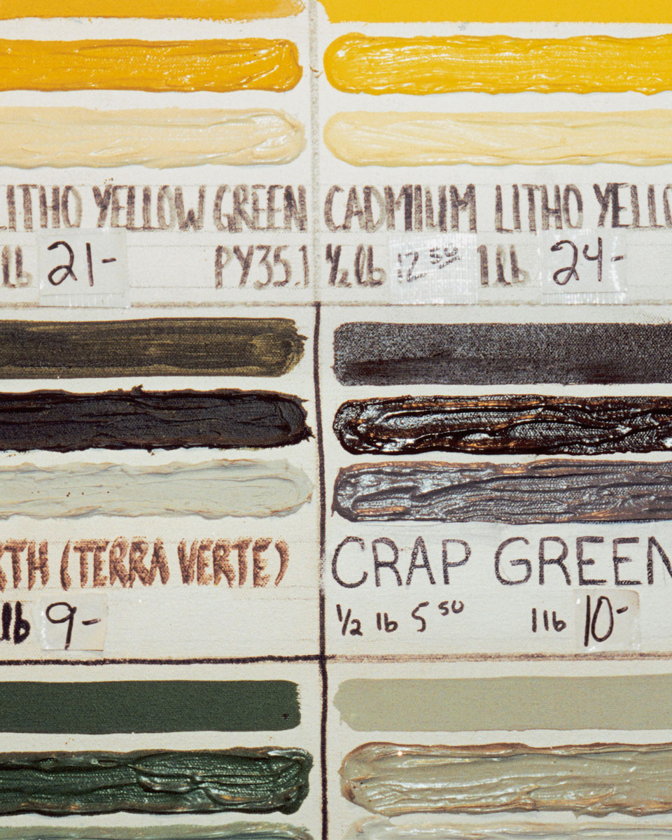 What annoyed Guerra and others like him in the early 80s was the perception that the paint companies tended to keep their clients partly in the dark. Labels on the backs of containers gave vague, and sometimes misleading, information about their products. It was not always clear, for instance, what particular pigment had been used to create a specific color. The pigment industry makes use of a coding system, whereby a color like Hansa Yellow 10G will be listed merely as PY3 in the ingredients on the side of a paint tube. Since artists do not typically have access to the codebooks, they cannot recognize in advance how intense or weak the hue might be. Guerra felt that in order to gain more control over their materials, artists should know exactly what elements made up the mixture. As he puts it, “artists haven’t been taught to worry about these things.”