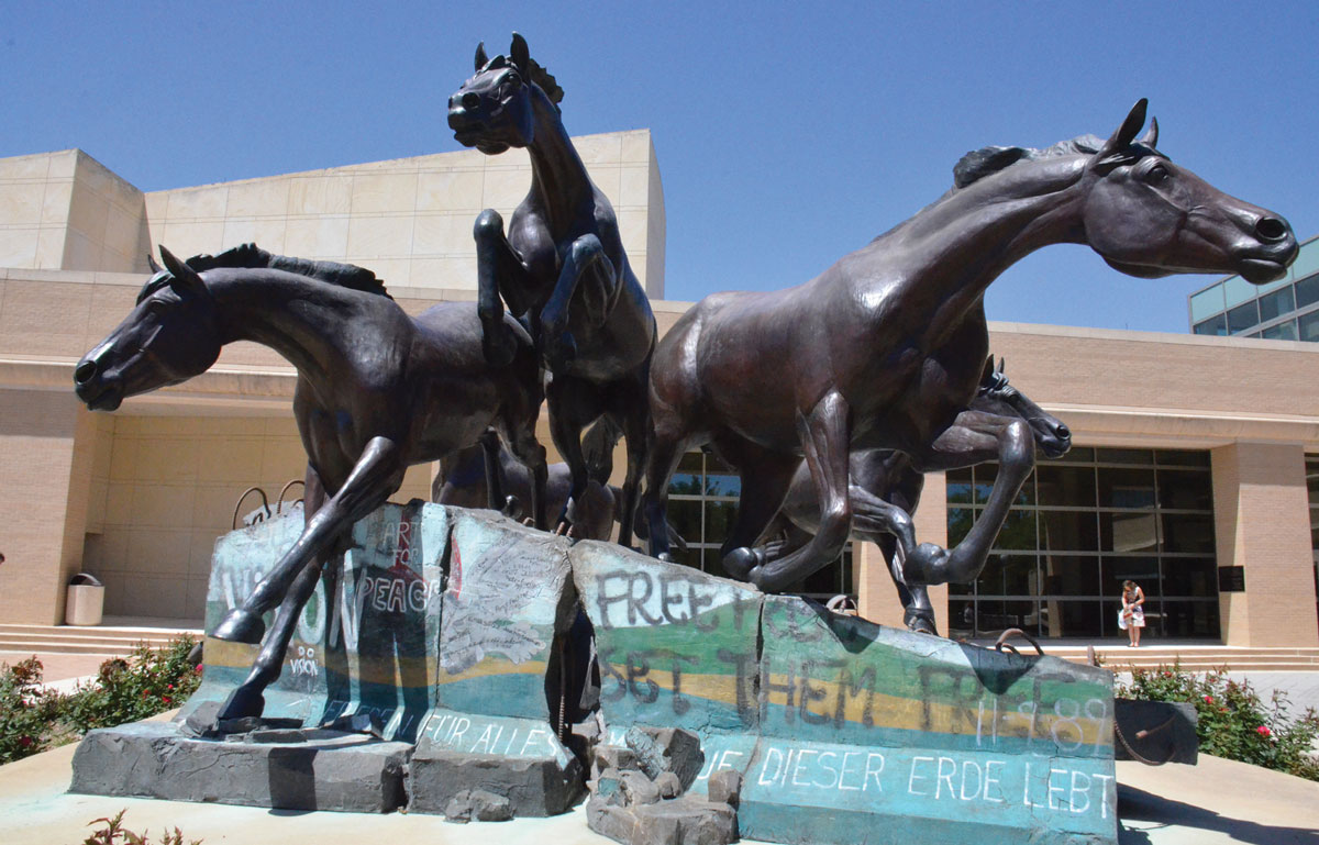 Speaking of empire, a photo of the sculpture that stands in the plaza in front of the presidential library of George H. W. Bush (see “Concrete Politics”) could not be printed along with the article because the portion of the Berlin Wall incorporated into the monument is in fact only a facsimile. But we publish it here because any account of postwar German-American relations would be poorer without it. According to the sculptor, “the horses simply represent humanity and the horses represent a victory of the human spirit.” Hmm. Horses, noses, humanity. Maybe some enterprising artist can concoct a Gesamtkunstwerk that manages to simultaneously evoke Frederic Remington, Nikolai Gogol, and Richard Bach?